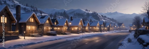 A small village with snow-covered houses and twinkling lights in the distance, cozy cabins, festive lights, houses