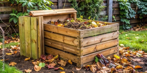 A small wooden composting bin with a lid partially opened, revealing a mixture of decomposing leaves and twigs surrounded by damp soil , backyard composter, nature