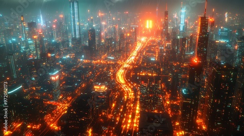 smart, city, night, glowing, communication, line, high technology, building, road, vibrant, neon, datum, web, digital, energy, urban, landscape, reflections, glasses, tower, hd, design, cinematic, lighting, fisheye, view, high-coloured, colours, pulse, flow, wireless, seamless, glow, streaming, skyline, modern, futuristic, tech
