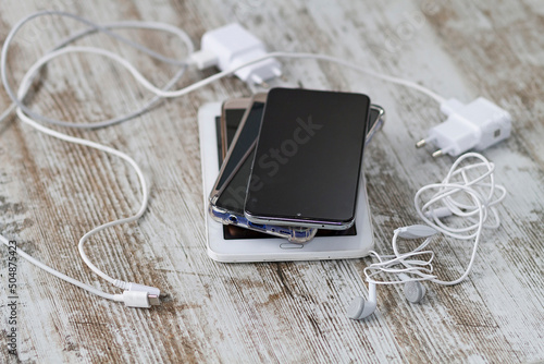 wooden, table, waste, ecology, hardware, damaged, garbage, obsolete, recycling, device, touch screen, portable, wireless, display, mobility, object, cyberspace, cellular, pile, concept, background, phone, screen, heap, stack, lifestyle, equipment, connection, mobile phone, smart, earphones, communication, mobile, jack, digital, connect, electronic, media, plug, stereo, white, music, technology, device, phone, wire, cable, smartphone