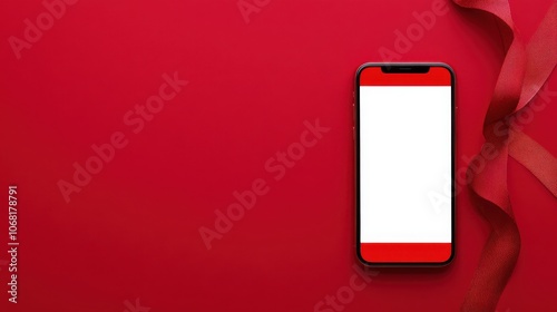 A smartphone is displayed on a vibrant red background, featuring a blank screen, and accompanied by a decorative ribbon.