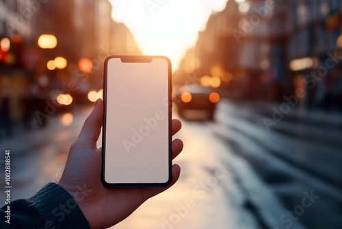 A smartphone with a blank screen in someone's hand, blurred city street in the background, morning light, minimalistic composition, mockup with blank space.