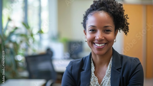 A smiling African American woman with curly hair wearing a black blazer and white blouse, standing in an office with green plants and a wooden door in the background.