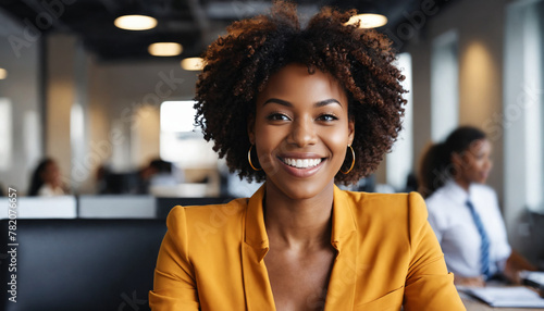 A smiling black woman with curly hair, wearing a yellow shirt is sitting in an office setting. Happy female employee or businesswoman.