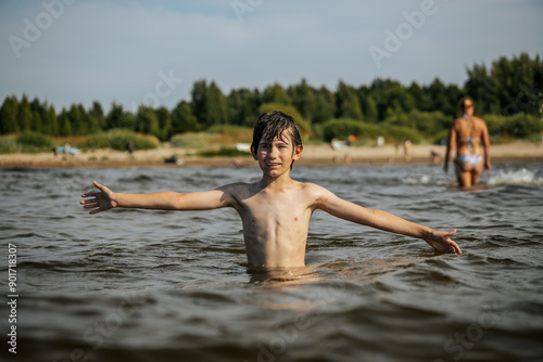 A smiling boy with arms outstretched stands in the water at a beach. Other beachgoers are visible in the background under a clear sky