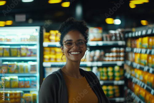 A smiling Brazilian woman posing in a brightly lit supermarket. In the background there are shelves with products and a refrigerator with drinks.