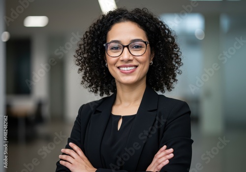 A smiling businesswoman with curly hair and glasses poses with her arms crossed in an office setting