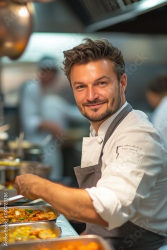 A smiling chef in a professional kitchen, preparing a dish. The chef wears a white coat and a gray apron, surrounded by various plates of food. The kitchen is busy with other chefs in the background.