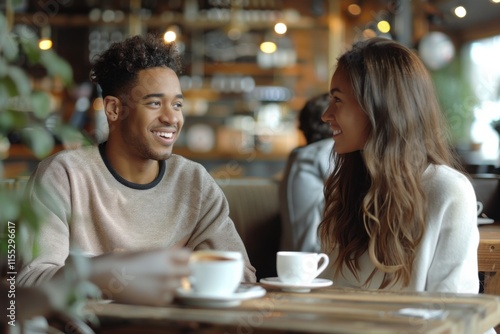 A smiling couple enjoys coffee at a cozy café, surrounded by a warm and inviting atmosphere. They share a joyful moment together.