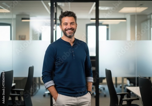 man, beard, smile, business, office, professional, corporate, work, employee, manager, executive, leader, colleague, team, meeting, collaboration, startup, company, career, success, achievement, ambition, confident, happy, friendly, casual attire, modern, interior, workspace, desk