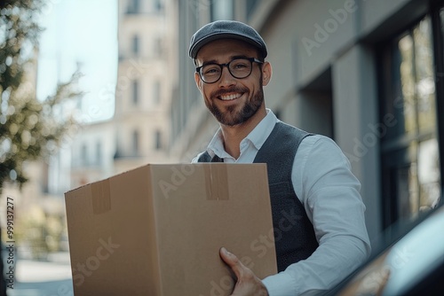 man, cardboard box, delivery, urban, smiling, cap, modern building, sunny, daylight, casual attire, city, happy, transport, logistic, customer service, professional, delivery person, working, lifestyle, inventory, moving, commerce, gesture, friendly, organisation, retail, service, neighbourhood, community, office, style, clothing, young adult, warehouse, greeting, business, architecture, environment, hand