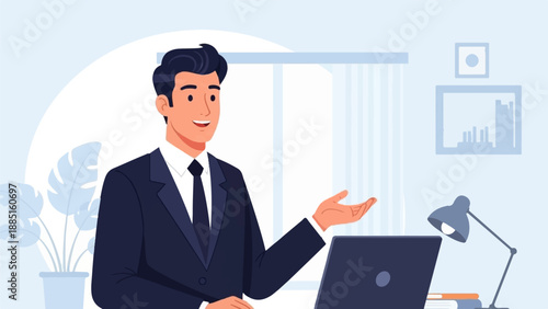 A smiling man in a suit gestures while working at a laptop in a light blue office