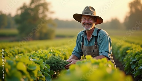 A smiling organic farmer harvests crops in a well-tended field, illuminated by natural light.