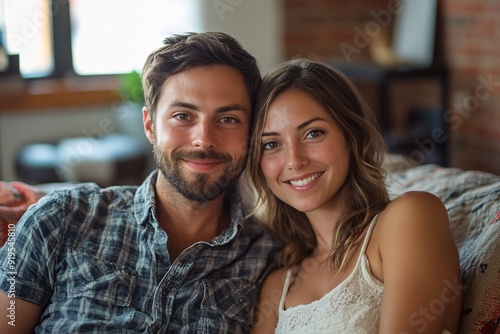 A smiling young couple relaxes together on a sofa, enjoying a cozy moment in their stylish living room filled with natural light