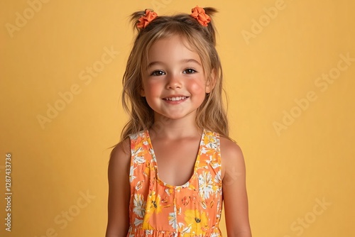 girl, children, portrait, smile, happy, face, blond, hair, young, cheerful, cute, pretty, dress, orange, flower, pattern, yellow, background, studio, sunlight, innocent, beautiful, joyful, delicate, charming, adorable, playful, light, skin, rose colored, cheek, looking, straight, pose, warm, positive, summer, fashion, style, elegant, simple, lovely, sweetness, elegance, front, view