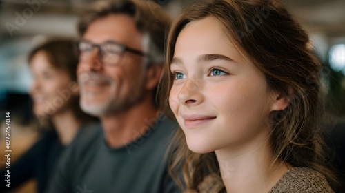 smiling, young, girl, family, colleague, modern, space, blurred, foreground, people, children, office, interaction, together, happy, content, adult, man, woman, business, professional, life, work, meeting, indoor, bright, light, sharpened, background, closeup, portrait, looking, up, side, eye, blue, freckle, hair, brown, sweater, casual attire, warm, positive, emotion, connection, joy, growth, future