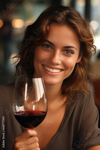 smiling, young, woman, drinking, glasses, wine, generative, ai, red, alcohol, drink, party, hand, holding, hold, happy, smile, female, girl, people, person, copy, space, indoor, inside, celebrate, celebration, 1, event, congratulation, goggles, adult, rose, beverage, summer, spring, caucasian, european, attractive, beautiful, white, beauty, face, lady, toast, lifestyle, eatery, night, model