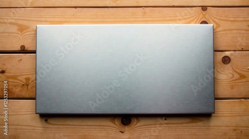 A Smooth Metal Panel Against a Rustic Wooden Background, Ideal for Mockups and Presentations