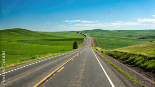 A smooth two-lane highway winding through rolling green fields under a clear blue sky, creating a tranquil, scenic drive with a limitless sense of exploration.
