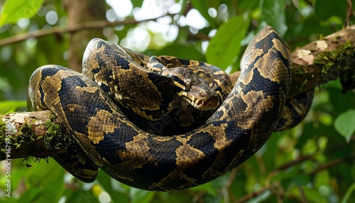 snake, coiled, tree branch, jungle, green, brown, scale, reptile, wildlife, nature, forest, animal, closeup, pattern, conservation, organism, fauna, macro, photo, photographic, image, tropical, humid, photo, snakeskin, texture, black, insect, natural, beauty, detail