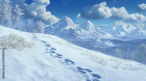snow, winter, nature, hill, footprint, outdoors, path, photo, white, mountain, horizontal, no people, trail, wilderness, color image, adventure, sky, cold, environment, landscape, travel, exploration, peaceful, serene, copy space, frost, ice, scenic, forest, tree, journey, solitude, glacé, person, frosty, beauty, footpath, mountain peak, tranquil scene, background, day, season, white color