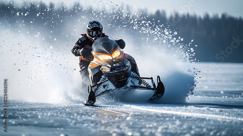 A snowmobile performing a high-speed drift around a bend on a frozen lake with ice shards flying in the air.