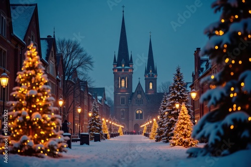snowy, city, christmas, light, church steeple, tree, yellow, red, decoration, ornament, street, festive, glowing, winter, aerial, night, holiday, celebration, cosy, sparkling, urban, illuminated, seasonal, cold, architecture, topview, city landscape, joyful, peaceful, night time, magic, birdseye, bright, colourful