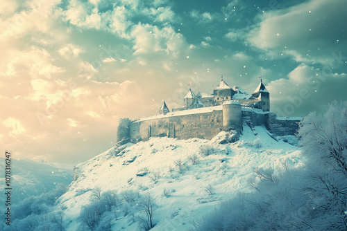 snowy, historical site, nostalgic, timeless, vintage, scenic, winter, serene, bold, vibrant, textured, tranquil, architecture, iconic, atmospheric, elegant, artistic, travel, winter scene, crisp, peaceful, seasonal, evocative, detailed, memorable