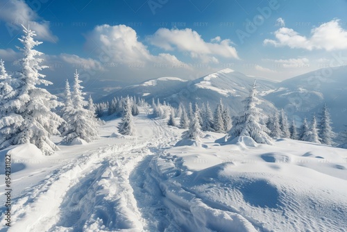 snow, mountain, trail, fir, tree, terrain, sky, winter, landscape, adventure, exploration, nature, calmness, path, sweeping, wonderland, cold, forest, peak, travel, seasonal, scenic, panoramic, beauty, white, blue, cloud, hiking, remote, solitude, chill, trekking, expansive, serene, environment, slope, altitude, outdoors, no people, glacé, pristine, wooded, expanse, clear day