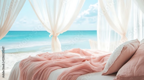 A soft pastel blanket on a canopy bed with flowing white curtains on beach background