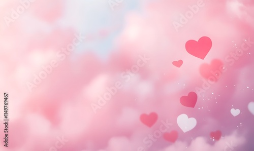 A soft pink gradient background with scattered red and white heart shapes of varying sizes, Generative AI