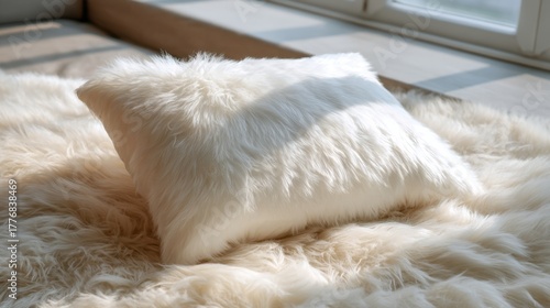 A soft white pillow rests on a fluffy rug illuminated by sunlight streaming through the window.