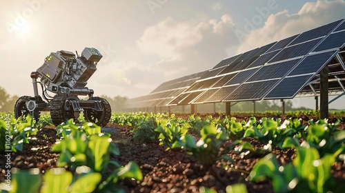 autonomous, robot, solar, energy, mechanical, tool, planting, seed, rural, farm, panel, tilted, sun, fertile, dirtied, crop, horizon, technology, innovation, agriculture, sustainability, environmentally friendly, farming, precision, machinery, growth, harvest, robotic, automation, efficiency, nature, environment, future, renewable, tech, green, eco, landscape, sustainable