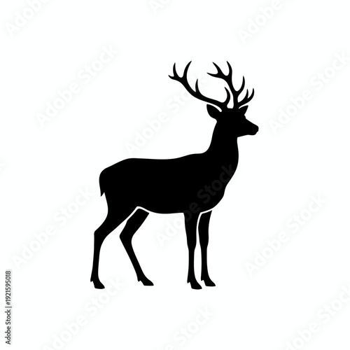 A solid black silhouette of a male deer with large antlers stands facing right against a white background.