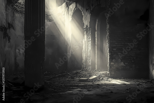 A solitary beam of light filters through a desolate hall, dramatically illuminating worn surfaces and evoking quiet introspection.