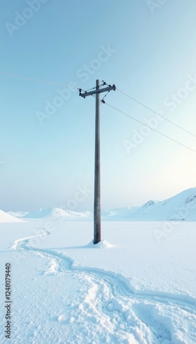 A solitary electric pole in a vast white expanse, snowy terrain, whiteout, icy lake