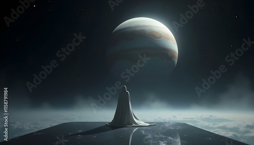 A solitary figure draped in a light, flowing cloak stands on a reflective futuristic platform, gazing at Jupiter from space. The planet looms majestically, with swirling clouds.