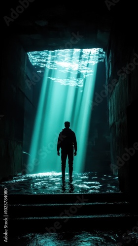 surreal, cinematic, lighting, composition, dreamlike, modern, impressionist, introspection, contemplation, pursuit, greatness, becoming, symbolism, inner, growth, expression, silhouette, figure, tunnel, cavern, underwater, mystical, enigmatic, moody, atmospheric, tranquil, serene, solitude, curiosity, imagination, wonder, journey, discovery, transformation, nirvana, epiphany, conceptual, spiritual