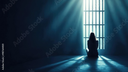 A solitary figure sits in a dimly lit cell, highlighted by beams of light pouring through a barred window.
