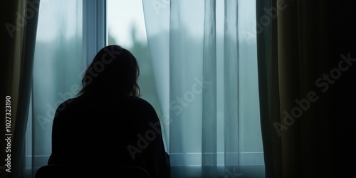 A solitary figure sits silhouetted against a rain-streaked window, evoking a sense of contemplation and introspection amidst a softly lit, moody ambiance.