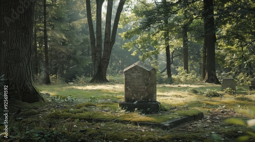 A solitary grave with a simple headstone in a peaceful cemetery, surrounded by tall trees.