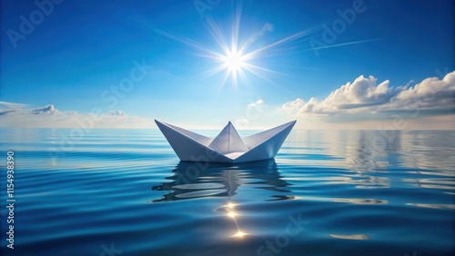 ocean, sea, water, sky, sun, cloud, boat, paper, ship, craft, horizon, calm, peaceful, serene, blue, white, sunshine, daylight, hope, journey, travel, adventure, dream, floating