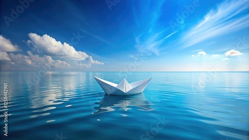 A solitary paper boat floats serenely on a calm ocean under a vibrant blue sky with fluffy clouds