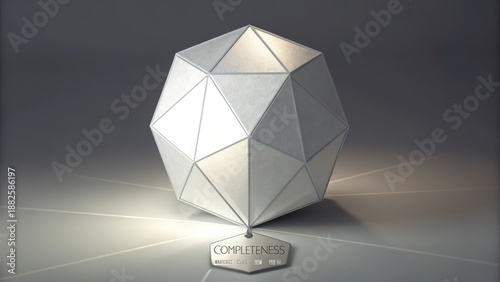 A solitary perfect geometric dodecahedron shape with a 'completeness' tag in a minimalist setting