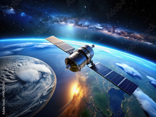A solitary satellite orbits in the blackness of space, its metallic body gleaming against the stunning blue and white backdrop of a partially illuminated planet Earth.