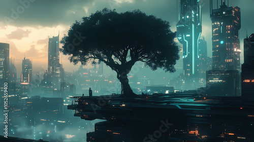 A solitary tree stands in a techno-futuristic city, contrasting the organic with a backdrop of technology. Techno-Futuristic City. Illustration