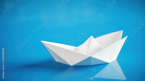 A solitary white paper boat floats serenely on a vibrant blue surface, reflecting the tranquility of the scene.