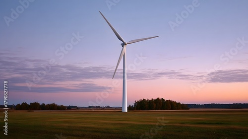 A solitary wind turbine stands tall in an open field during the colorful twilight sky