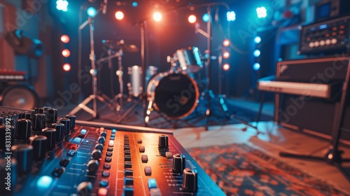 A sound board and drums are set up in a recording studio, ready for a session of music production and mixing. Generative AI