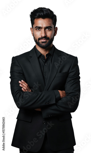 south, asian, male, leader, sleek, black, arm, crossed, focused, expression, illuminated, digital, leadership, professional, smiling, corporate, head shot, success, career, elegant, friendly, modern, stylish, ambitious, portrait, isolated, transparent, background, clear, cut-out